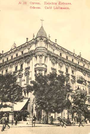 Дом Либмана на углу Преображенской и Садовой по честному принадлежит Дерибасовской (я не ошибся в психологической свей оценке - адрес на дореволюционной афишке звучит так: "Кондитерская Либмана, угол Дерибасовской и Преображенской улиц, против Соборной площади в собственном доме"). Его проектировал одессит, немец Э. Мэснер, для одессита и немца Макса Либмана. Когда-то на этом углу стояло двухэтажное здание старой гауптвахты, с 4-колонным портиком. И за ним по Садовой жилой 2-этажный дом на высоком цоколе с рустованными стенами. На их месте, в лучшей точке Города, и стал дом Либмана.