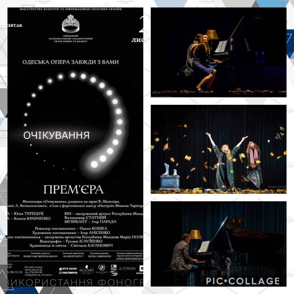 Молодой режиссер Павел Кошка впервые в Одесской опере создал монооперу “Ожидание”, объединив сонеты Шекспира, чувственные строки Цветаевой, поэзию Вознесенского, Рождественского, мелодии Таривердиева, балет, соло на фортепиано и visual art.