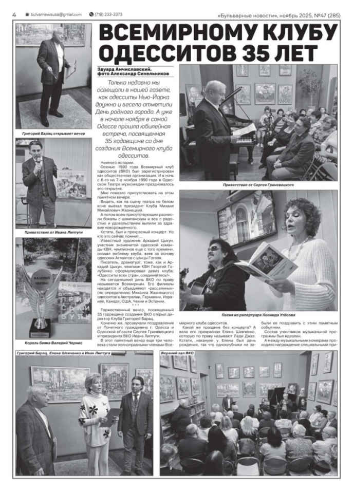 27 листопада 2025. Про ювілей ВКО у газеті «Бульварные новости» Про ювілей ВКО дізналися в Нью-Йорку. Закордонний член Клубу та наш давній друг Едуард Амчиславський опублікував у газеті «Бульварные новости» великий матеріал і фоторепортаж Олександра Синельникова про свято, що відбулося. 0