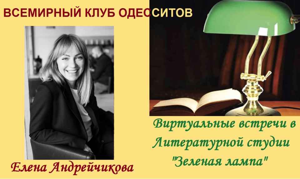 Елена Андрейчикова - писатель, переводчик, журналист, автор сборников "Женщины как женщины", "Остаться дома в понедельник", "Таємне понеділкування", "Акулы тоже занимаются любовью", "Нежные выживут", романа "Тени в профиль", лауреат многих литературных конкурсов студийцам «Зеленой лампы» и одесситам Елена известна, прежде всего, как красивый и энергичный человек, многогранные таланты которой восхищают.