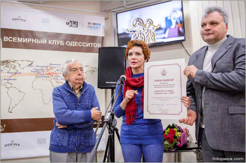 Далее наступила очередь огласить «Событие года-2018». В течение всего прошлого года происходило много значимых для города событий. С немалыми трудностями были выделены два наиболее важных из них. Это спектакль Одесского кукольного театра « Бабы Бабеля» и Чемпионат мира по плаванию на большой открытой воде «Oceanman Odessa».