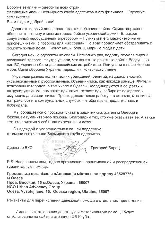 С надеждой и уверенностью в вашей поддержке, от имени всех членов Всемирного клуба одесситов,