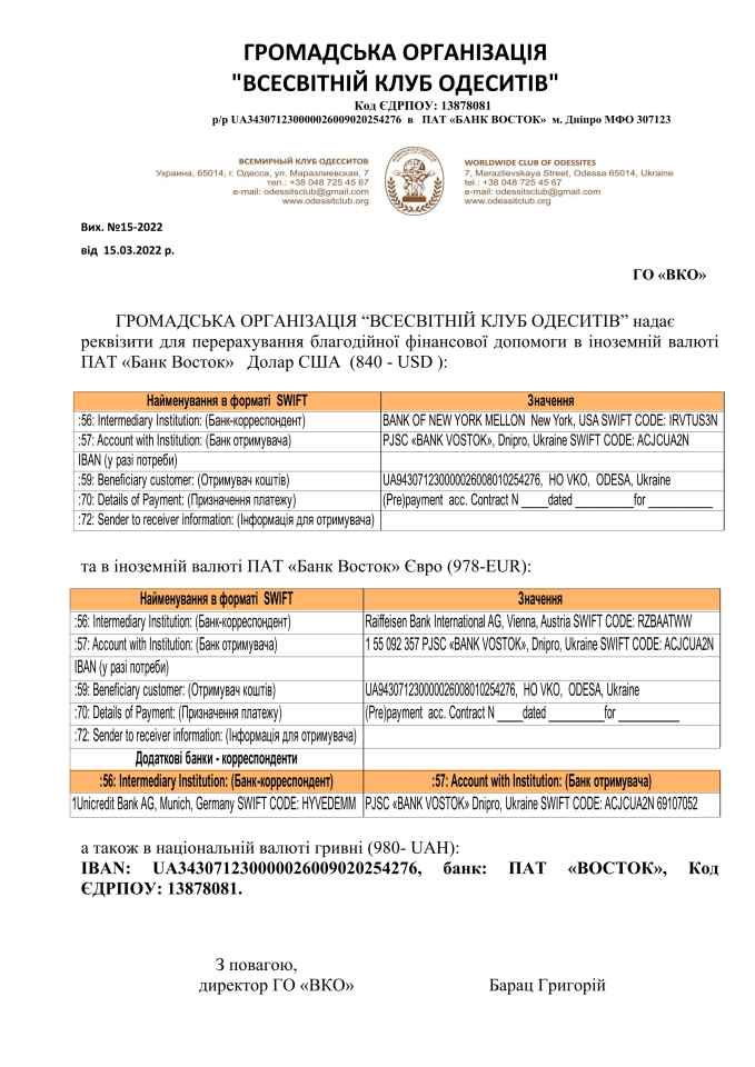 ОБЩЕСТВЕННАЯ ОРГАНИЗАЦИЯ “ВСЕМИРНЫЙ КЛУБ ОДЕССИТОВ” предоставляет реквизиты для перечисления благотворительной финансовой помощи в иностранной валюте: